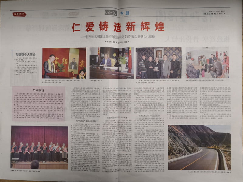 2018年11月7日,《信陽晚報》刊發了對河南永和建設集團有限公司黨支部書記、董事長孔德穩的相關專訪內容,文章對于孔德穩的創業之路、經營之道、踐行企業社會責任之舉以及弘揚傳統文化之策進行了深刻剖析。