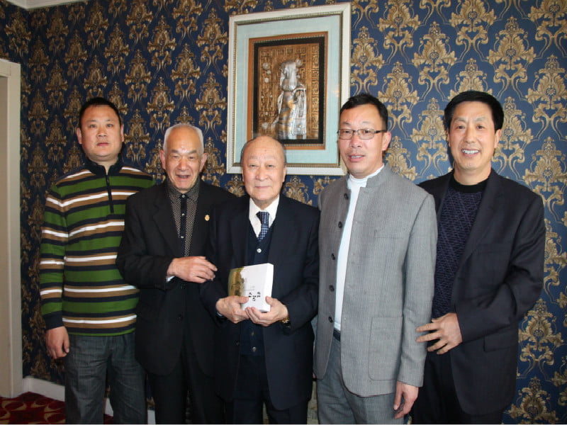 92歲高齡的世界孔子聯誼總會會長孔德墉(左三)與出席曲阜祭孔大會的信陽籍代表合影留念